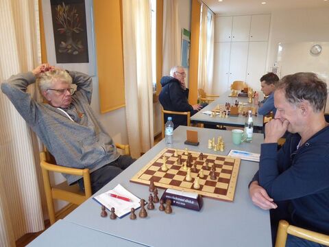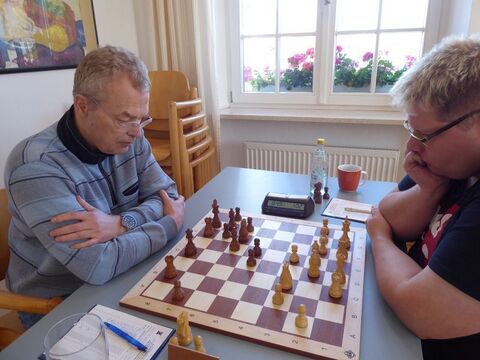 Insgeheim träumten wir nun sogar von einem Mannschaftssieg, denn Elmar an Brett 3 (Schwarz) hatte sich in ein vorteilhaftes Springerendspiel vorgearbeitet, während Winfried an Brett 2 (Weiß) einen Mehrbauern in Form eines gedeckten Freibauern besaß. Doch der schwarze Springer von Winfrieds Gegner wirbelte unglaublich behende zwischen Verteidigung und Angriff hin und her und komplizierte das vermeintliche Gewinnspiel. Sukzessive wurde aus der weißen eine schwarze Gewinnstellung, also doch wieder Rückstand 3:4 um 14:20 Uhr.