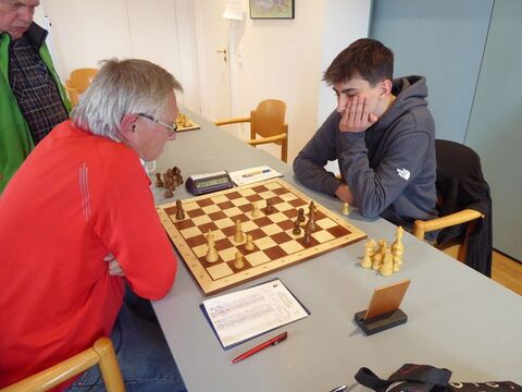 Und wieder eilte ein Junger zu Hilfe, denn drei Minuten später erzwang Julian an Brett 7 mit den schwarzen Steinen ein Endspiel mit gleichfarbigen Läufern und einem gesunden Mehrbauern. Bevor sein zentraler König einen zweiten Mehrbauern erobern konnte, zog Weiß die Notbremse. Erneut Ausgleich, 3:3 um 13:47 Uhr.