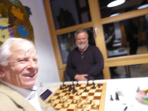 Gernot ist in der Form seines Lebens, wurde an Brett 4 (Schwarz) nur durch Blitzgeräusche von Nachbarbrettern gestört. Trotzdem schaffte er es in einem Turmendspiel, in der a-Linie einen Freibauern zu bilden und dem Gegner einen Doppelbauern in der g-Linie anzuhängen. Durch jugendlichen Leichtsinn verlor er aber einen Bauern am Königsflügel zurück und willigte schließlich in sein drittes Remis der Saison ein. Der 3,5:0,5-Auswärtssieg war üppig genug.