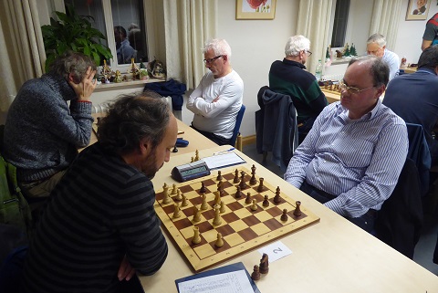 Jetzt durfte Gebhard an Brett 4 (Schwarz) aufatmen. Er hatte sich in ein verlorenes Bauernendspiel getauscht, statt seine dominanten Figuren auf dem Brett zu halten. Doch in jener Stunde war alles Harmonie, 4,5:1,5.