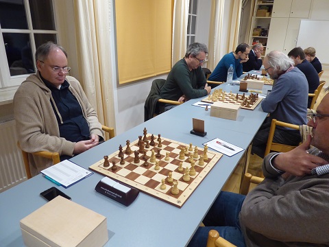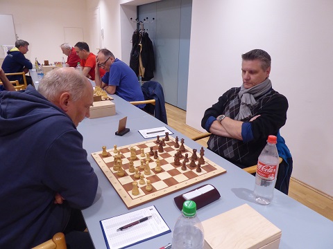 Sergiu (Brett 7, Schwarz) büßte im Mittelspiel durch ein häufig übersehenes taktisches Manöver (Abtausch mit Abzugsangriff und Rückkehrmotiv) eine Leichtfigur ein. Sein Gegner ließ sich aber nicht lumpen und verlor wenige Züge später die Figur zurück, immerhin unter Wiederherstellung des Bauerngleichstands. Also verblüffendes Remis zum 4:1. „Jetzt können wir wenigstens nicht mehr verlieren“, atmete der Tafelanschreiber auf.