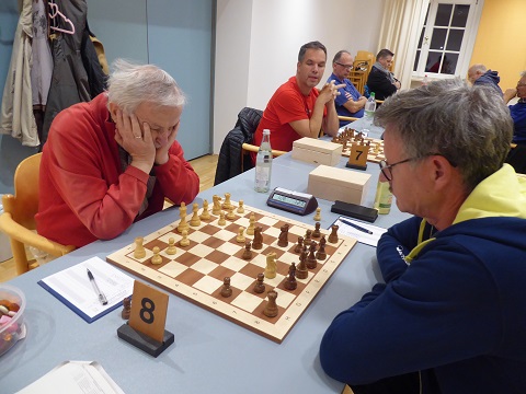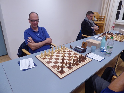 Eine Eröffnungsvariante, auf deren trickreiche Anwendung er „seit 20 Jahren“ gewartet hatte, spielte Dieter überraschend angriffslustig an Brett 8 (Weiß). Er opferte einen Springer auf f7 und erhielt dafür tempostarke Drohungen mit schließlicher Rückeroberung der Figur. Seine zwei resultierenden Mehrbauern verwertete er im Turmendspiel mit lehrbuchartiger Abschneidung des gegnerischen Königs. 2,5:0,5.