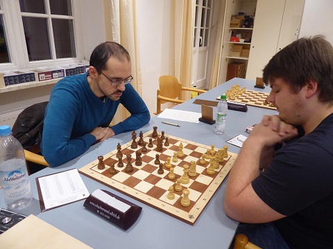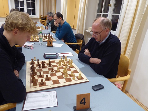 Johannes traf an Brett 2 (Weiß) auf einen zähen Verteidiger, der ohne Zögern ein unklares Figurenopfer annahm. In Zeitnot unterliefen dem Schwarzen jedoch kurz nacheinander zwei Rechenfehler, die jeweils einen halben Punkt kosteten. 6:1, das empfanden sogar die Hausherren als heftig.