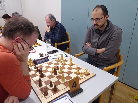 An Brett 4 (Weiß) schüttelte Mannschaftsleiter Stephan seinem Gegner plötzlich die Hand zum Remis. Eine langanhaltende weiße Initiative führte im Leichtfiguren-Endspiel zur allgemeinen Verwunderung nicht weiter. Also glimpflicher Halbzeitstand 2:2.