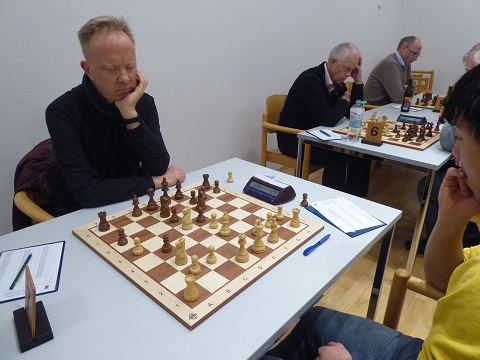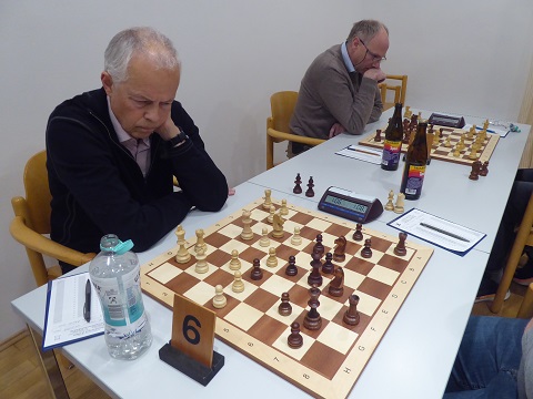 Naja, fast in Ordnung, denn eine Minute später erlag Gebhards König an Brett 5 (Schwarz) einem unwiderstehlichen weißen Angriff, der mit einem unscheinbaren Bauerngewinn begonnen hatte. 1,5:1,5.