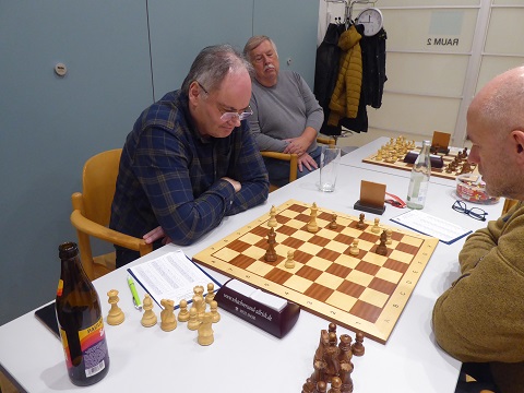 An Brett 7 gewann Sven mit den schwarzen Steinen innerhalb einer Stunde eine Figur, genoss die Gewinnstellung aber den ganzen Abend und beendete seine Partie als vorletzte.