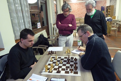 Einen weiteren ausgleichenden Schlagabtausch lieferten sich die Bretter 5 und 6: Ulis (Weiß) vorgerückter Zentrumsbauer entpuppte sich eher als Schwäche denn als Stärke; er zuckte vor einem verlockenden Springeropfer zurück und geriet dadurch in den Rückwärtsgang. Peter I. führte dafür seine schwarzen Steine zu einem klassischen positionellen Sieg, bei dem der Neuperlacher nie den Hauch einer Chance hatte. Zwischenstand 2:2.