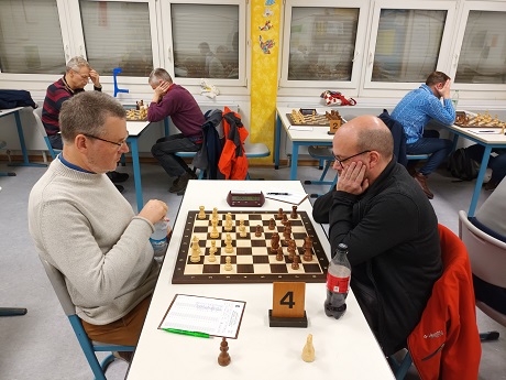 Mannschaftsführer Andreas K. an Brett 4 (Weiß) hatte zum wiederholten Male in der Saison Probleme, einen Vorteil aus der Eröffnung herauszuholen. Wahrscheinlich ist hier eine grundsätzliche Umstellung dringend erforderlich. Am Brett führte das (zu) ruhige Spiel jedenfalls nur zu einer vollkommen ausgeglichenen Postion bei symmetrischer Bauernstellung. 2,5:1,5