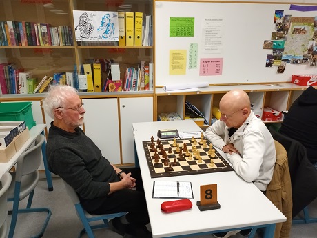 Dies war durchaus wichtig, an den verbliebenen zwei Brettern sah es leider eher düster für uns aus. Joachim wählte an Brett 7 mit Schwarz einen zweischneidigen positionellen Aufbau. Die Stellung seines Gegners spielte sich jedenfalls bedeutend einfacher und Joachim schaffte es nicht, der weißen Initiative auf dem Damenflügel etwas entgegenzusetzen. 4,5:2,5