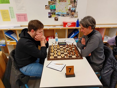 Walter an Brett 1 (Schwarz) war seine lange Matchpause kaum anzumerken. Gegen einen starken Gegner glich er mit präzisem Gegenspiel im Zentrum voll aus und erreichte ein sicheres Unentschieden. 1,5:0,5