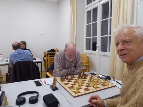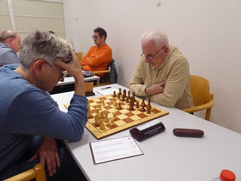 Jetzt hing alles an den Brettern 1 und 2. Walter führte am Spitzenbrett die schwarzen Steine und kämpfte sich in ein Springerendspiel mit gleicher Bauernanzahl. Hans Christoph hatte ein kompliziertes Doppelturmendspiel auf Brett 2 (Weiß). Die vier beteiligten Spieler beäugten ständig auch das jeweilige Nachbarbrett, um abzuschätzen, welches Ergebnis ggf von ihnen erwartet würde. HC bot Remis, weil er dachte, dass Walter ebenfalls Remis halten würde. Das Remisangebot wurde abgelehnt, und im Nachhinein können die Haarer sagen: Zum Glück!