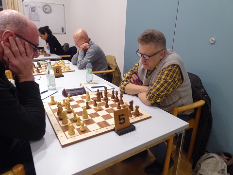 Eines ist jedenfalls klar: Selber spielen beißt sich mit Berichterstattung. Daher beginnt der vorliegende Bericht in der Mitte, nämlich beim Stand von 3:1 für die Gastgeber, nachdem Andreas (Brett 5, Schwarz) und Ulrich (Brett 6, Weiß) gewonnen und Cherin (Brett 3, Schwarz) und Joachim (Brett 4, Weiß) remisiert hatten.