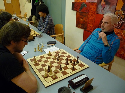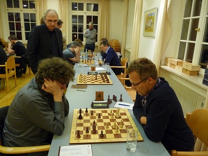 Aber an den vorderen Brettern bahnten sich zähe Verteidigungskämpfe an. Wie oft in passiven Stellungen, führte die ständige Anspannung irgendwann zum Verpassen des einzigen Grünzweigs im Variantenbaum. So mussten Andreas K. (Brett 2, Weiß) und Stephan (Brett 1, Schwarz) den Umschwung zugunsten der Gäste quittieren. 2:3.