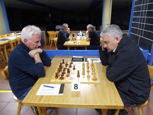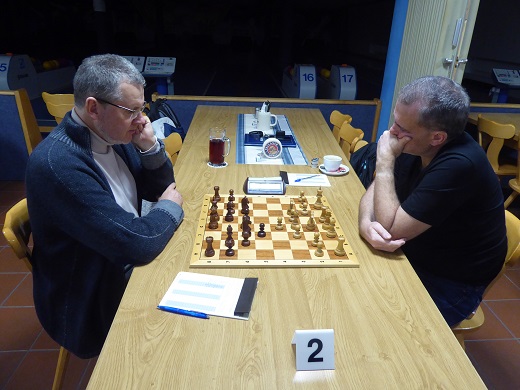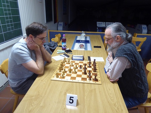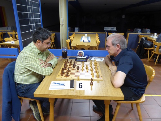 Andreas K. an Brett 2 (Schwarz) wollte sich durch den betont ruhigen Aufbau seines bekannten Kontrahenten (ein australischer FM) nicht zur Sorglosigkeit verleiten lassen und setzte im Mittelspiel einige exakte Nadelstiche, die beim Weißen einen deutlichen Zeitverbrauch zur Folge hatten. Im weiteren Partieverlauf holte Andreas zeitmäßig leider auf und schaffte es nicht, seinen spürbaren positionellen Vorteil beim Übergang ins Endspiel weiter zu verdichten, daher folgte hier ein gerechter Remisschluss.