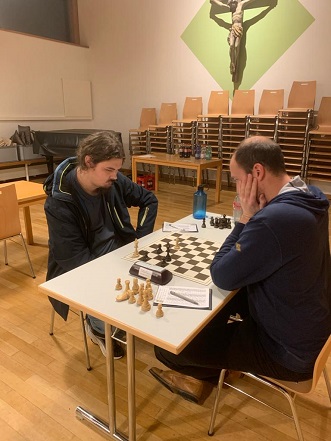 An Brett 1 bekam Sergiu natürlich den stärksten Spieler im Raum zugelost. Er kämpfte zwar unermüdlich und ohne großen Fehler, fand sich aber im Laufe der Partie trotzdem immer stärker zurückgedrängt wieder. Um ca. 22 Uhr war die Lage schlussendlich aussichtslos und Sergiu musste sich geschlagen geben. 1:1