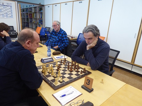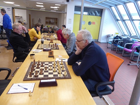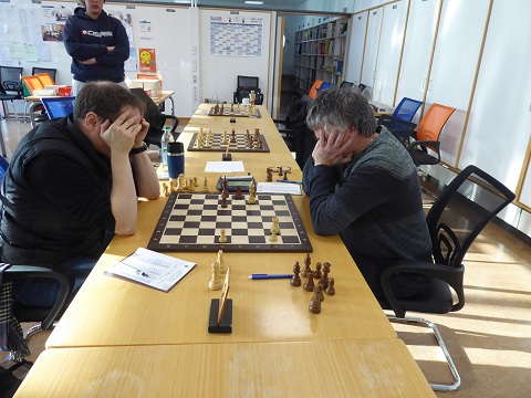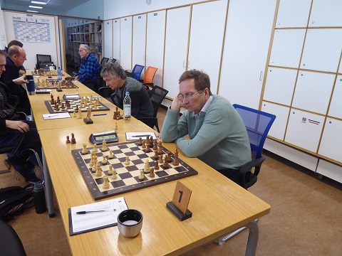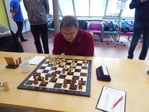 Auch Winfried (Brett 5, Schwarz) gewann ausgangs der Eröffnung scheinbar mühelos einen Bauern, aber was ihn dann lange beschäftigte, war ein möglicher Einschlag seines Läufers auf h3. Dieser Versuchung widerstand er wegen Unberechenbarkeit für Menschen, nur der Computer hätte es tatsächlich mit Vorteil gespielt. In der Partie blieb es bei einer Punkteteilung, weil der Mehrbauer nicht flott zu bekommen war. 2:2.