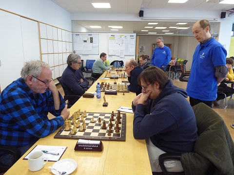 Dann ging es Schlag auf Schlag, innerhalb derselben Minute endeten die Partien von Rainer an Brett 1 (Schwarz) und Hagen an Brett 6 (Weiß). Äußerst lehrreich, den Angriff an Brett 1 zu sehen: Frühes h4 drohte ständig mit Unterminierung der schwarzen Königsstellung (Fianchetto) und Opfereinschlägen, gleichzeitig wich Weiß allen Abtauschversuchen aus, die eine Erleichterung der Lage hätten bringen können. Am Schluss gab es für den schwarzen König kein Entrinnen mehr, 3:2 für die Gäste.