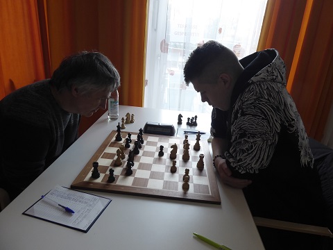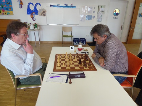Winfried gelangte an Brett 7 (Weiß) in eine verschachtelte Bauernstellung, die keiner der Kontrahenten zu öffnen wagte, weil die Folgen --- Boom oder Bumerang --- unabsehbar waren. Also Punkteteilung zum Zwischenstand von 1,5:0,5 für die Haarer.