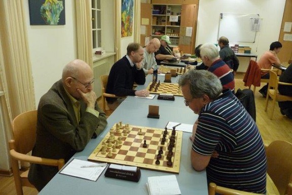 Es scheint, als wären danach die Dämme gebrochen und es regnete Punkte. Konrad, der freundlicherweise das Anschreiben der Ergebnisse übernahm, kam, so mein Eindruck, mit dem Berichtigen des Spielstands nicht mehr nach. Es ging Schlag auf Schlag. Bernhard, mit Eiltempo ins gewonnene Endspiel (ich überlegte gerade meinem 12. Zug) zum 2 - 0. Joachim 3 - 0. Vermutlich Uli zum 4 - 0. Bruno 5 - 0. Dann, ein "Schwächeln". Josef zum 5,5 - 0,5.