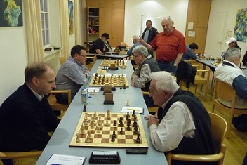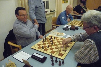 Allenfalls Bernhard, der mit einem Verlustbauern zu kämpfen hatte, sorgte für einen kurzen Moment der Hoffnung für die Gegner. Doch gewieft schaffte Bernhard sich zwei vorgerückte und verbundene Freibauern am Damenflügel. Der Gegner begann mit einem Gegenspiel am Königsflügel, blockierte die Freibauern und die Partie endete Remis. Immerhin, schon ganze 2 Punkte.