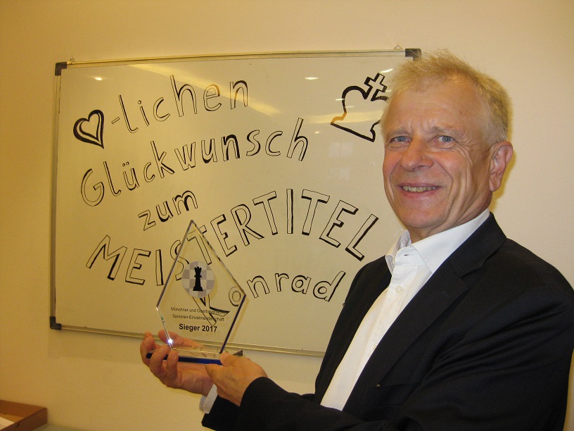In einer spannenden letzten Runde konnte sich Konrad gegen Jürgen Rennenkampff (SC Tarrasch) durchsetzen und gewann den Titel vor dem 2-maligen Sieger Boris Miskevicer (SG Schwabing München Nord). Der Haarer Erfolg wird abgerundet durch den ausgezeichneten 3. Platz von Walter Schmidt. Herzlichen Glückwunsch unseren beiden erfolgreichen Kämpfern!