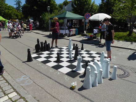 Größter Blickfang war wieder das Gartenschachbrett auf der Straße, an dem Besucher mit Kindern praktisch nicht vorbeikamen. Viele Gespräche rankten sich um die Jugendarbeit des Schachclubs, angestoßen sowohl von bildungsbeflissenen Eltern als auch von den Nachwuchsstars selbst. Wenn auch nur die Hälfte der Begeisterung übrig bleibt, freuen wir uns doppelt über unsere großen Trainingsräume in der Mittelschule Haar am Freitagnachmittag --- und auf das Knacken en passant der historischen Schallmauer 100 unserer Mitgliederzahl.