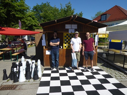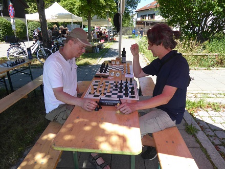 Tobias, Stephan VZ und Michael R bewiesen unendliche Geduld am Gartenschachbeet. Schrebergärtner Manfred brachte Marmorkuchen vorbei. Uli führte seinen jüngsten Beinahe-Sieg aus der MMM vor. Walter und Joachim duellierten sich im Blitzschach. Michael B, Julia L und Korbinian halfen Interessenten beim Lösen der Schachaufgabe am Demobrett. Die „kleine Julia“ schaute als Rotkreuzhelferin vorbei und testete ihre Orientierung zwischen den großen Figuren. Schatzmeister Markus, als Selbständiger immer in Zeitnot, schaute trotzdem vorbei.