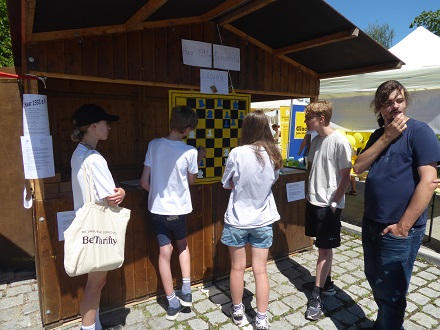 Der planerische Elan und unermüdliche Trommeleinsatz von Tobias vereinte wieder einmal ein ganzes Team von Schachkollegen zum Aufbauen und Bemannen/Befrauen unseres Standes Nr. 68 an der Haarer Ecke Kirchenstraße / Gronsdorfer Straße. Walter setzte eine vermeintlich leichte Schachaufgabe "Matt in 3" aufs Demobrett, dieses wirkte auch auf die Passanten magnetisch, nicht nur weil den Löser*innen Gummibärchen winkten.