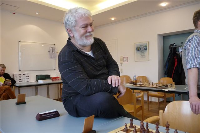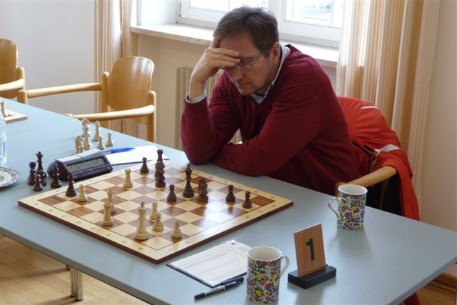 Am frühen Nachmittag folgte sogar ein Schwarzsieg an Brett 1. Rainers Beherrschung brettumfassender Abtauschketten gipfelte zunächst in einem schwierigen Materialvorteil (zwei Springer für einen Turm). Ein als Verteidigung getarnter Springerrückzug fing dann auch noch den weißen Turm auf b5, und schon klammerte sich der Pluspunkt im wahrsten Sinn des Wortes an unsere Ergebnistafel.