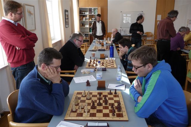 Schnelle Mittagspause erreichte Walter (Brett 5) durch ein wertvolles Remis mit den schwarzen Steinen. Für alle, die es noch nicht wissen: Die Regionalliga-Partien lassen sich online nachspielen auf der Webseite des Bayerischen Schachbunds unter