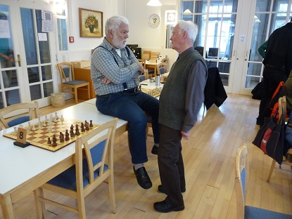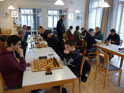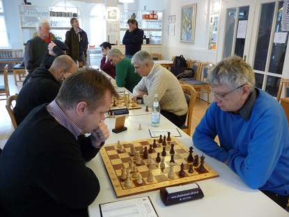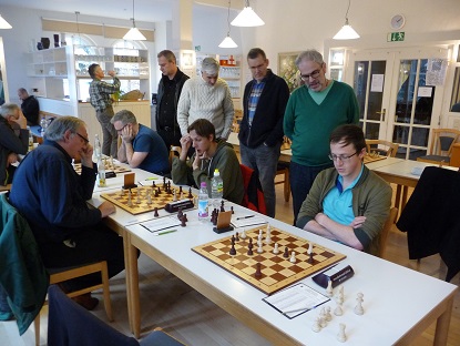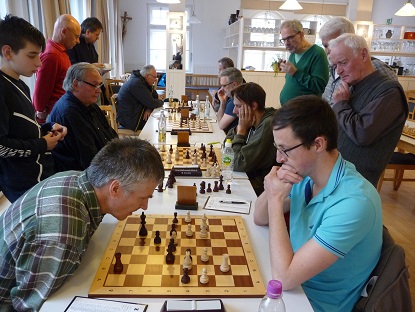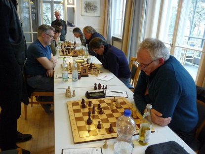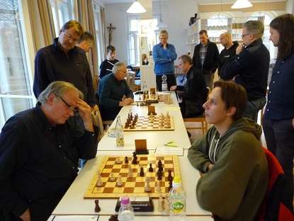 Kurz danach punktete auch Peter S. an Schwarzbrett 7 mit Dame und Springer gegen das weiße Turmpaar. Weiß überschritt in dieser materiell nachteiligen Lage die Zeit. 3:0.