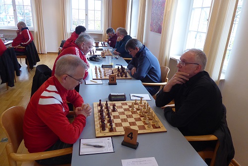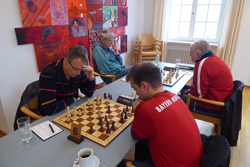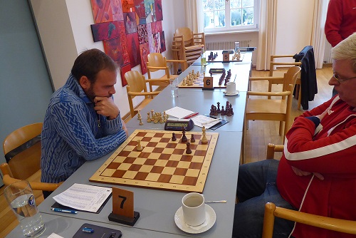 Jetzt mussten es die drei verbliebenen Schwarzspieler richten. Das Drama trieb an Brett 5 einem tragischen Höhepunkt klassischen Ausmaßes zu. Winfried war mit Initiative aus seiner erprobten Eröffnung gekommen und schritt zur taktischen Ernte. Er freute sich so sehr über einen zweiten Bauerngewinn, dass er den gleichzeitig einstehenden weißen Läufer g2 weiterleben ließ. Danach wurde das Spiel plötzlich überraschend komplex, als Weiß zu einem verzweifelten Gegenangriff überging. In dem hohen Seegang kippte die Partie, ein Tribut an die Nervengöttin (Minerva?). Zu allem Überfluss stellte sich nach der Partieaufgabe heraus, dass der Computer ein verstecktes Remis in Form einer langen Dauerschachvariante anzeigte. Hier helfen nur goldener Humor und das Wissen, dass jeder Schachspieler ein Lied von solchen Erfahrungen singen kann. Stand 1,5:4,5.