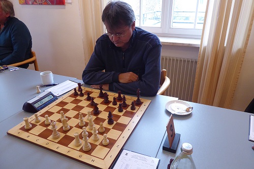 Ein kompliziertes Gefecht lieferte sich Helmut am Spitzenbrett (Schwarz). Die beginnende Bauernkaries im Endspiel wollte er sich aber nicht mehr anschauen. 1:2.