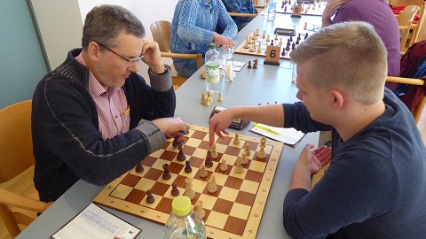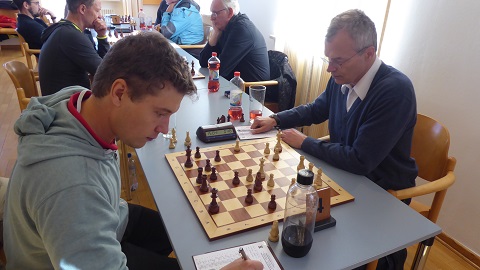 An Brett 5 traf Anton (Schwarz) auf einen Gegner, der bewusst oder unbewusst eine Figur für Königsangriff opferte. Antons jugendliche Nerven nahmen umsichtig alle Gefahren aus der Stellung und führten das materielle Übergewicht immer deutlicher zum Sieg. 3,5:0,5.
