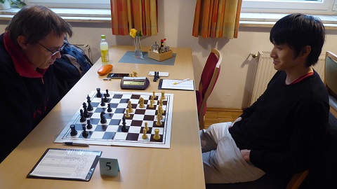 Helmut wurde ein Opfer der Wochenendbaustellen der U-Bahn und kam daher schon gestresst an. So bot er bereits im 7. Zug seinem verblüfften Gegner Remis an. 1,5:0,5 für die Gastgeber.
