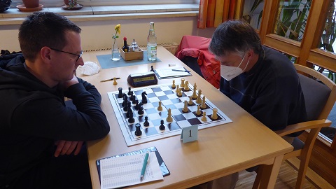 Ähnlich erging es Hagen (Brett 3, Weiß) wegen eines zunächst vergessenen Impfausweises, der mühsam geholt werden musste. Auch er schloss daher bereits im 7. Zug Frieden. 2:1 für die Hausherren.