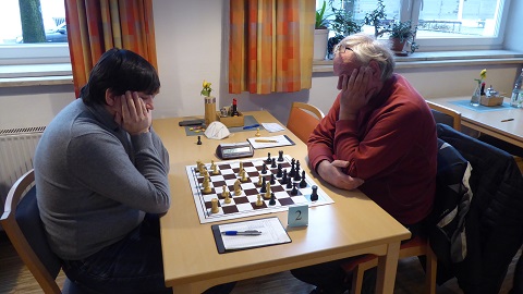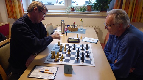 Christoph und sein Gegner an Brett 2 kennen sich inzwischen aus mehreren Begegnungen gut genug, um beiderseits Vorsicht walten zu lassen. In einem materiell gleich stehenden Turmendspiel einigten sich auch diese Kontrahenten auf Remis. 3:3.