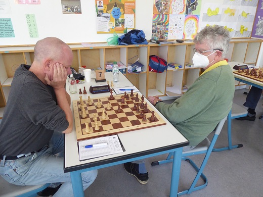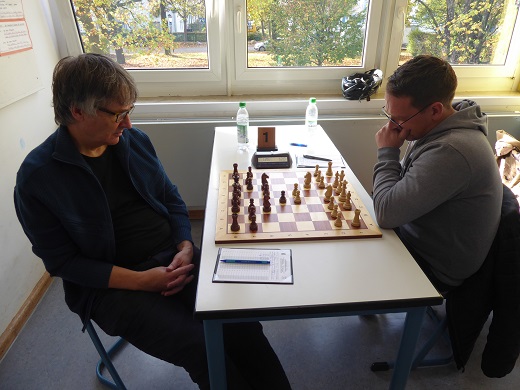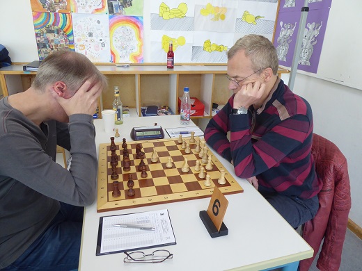 An Brett 5 bekam Elmar (Schwarz) sogar einen freien Sonntag geschenkt, denn sein vorgesehener Gegner erschien nicht. Also Startvorsprung 1:0.