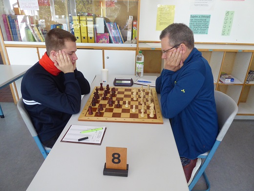 Alle anderen Partien reiften ganz langsam zur Entscheidung heran. Andreas K. brachte sich an Brett 8 mit Weiß scheinbar kontaktlos in Idealstellung und ging dann zu handfesten Beunruhigungen des Königsflügels über. Bei einem zweiten schwarzen Bauernverlust hatte der Gegner genug gesehen und gab auf. 3:1 um 13:10 Uhr.