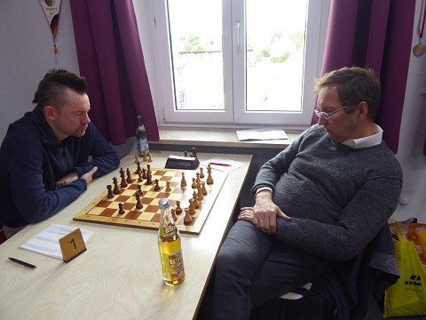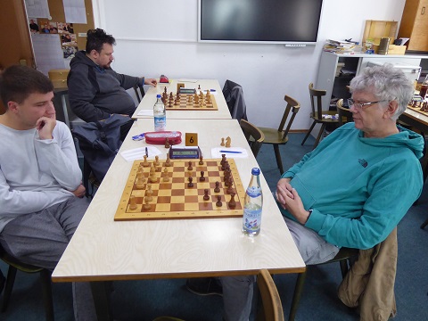 Hagen stellte seine Schwerfiguren an Brett 5 (Weiß) klassisch in den Zentrallinien auf, musste aber einer schwarzen Expansion am Damenflügel zusehen, die die Koordination seiner Figuren störte. Bei schrumpfender Bedenkzeit griff er daher zu einem Remisangebot. 2,5:0,5 um 13:05 Uhr. Ein ähnliches Rezept wandte Anton an Brett 3 (Weiß) an. Als seine Dame auf der siebten Reihe keine Verstärkung fand, willigte er in eine Zugwiederholung ein, um am Brett nicht mehrere Gegendrohungen jonglieren zu müssen. 3:1 um 13:20 Uhr.