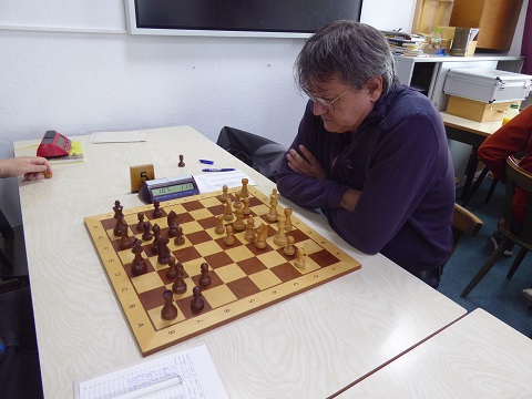 Jetzt war es egal, dass Viktor an Brett 2 (Schwarz) seinerseits durch einen weißen Läuferspieß gegen seinen Springer einen zweiten Bauern verloren hatte und in ein Endspiel mit einer winzigen Schwindelchance (falscher Läufer) gehen musste. In Erinnerung wird die Partie aus einem kuriosen anderen Grund bleiben: Viktor machte zwei Züge hintereinander! Er hatte nach einem Zug vergessen, die Uhr zu drücken, verließ kurz den Saal, sah bei der Rückkehr, dass seine Zeit lief, und glaubte daher am Zug zu sein. Also zog er rasch, aber der Gegner protestierte natürlich und ließ den Schiedsrichter kommen. Der Fehler wurde korrigiert, der Gegner erhielt zwei Minuten Zeitgutschrift, und die Partie ging ihren Gang. Endstand 5:3 für die Haarer gegen 14 Uhr.
