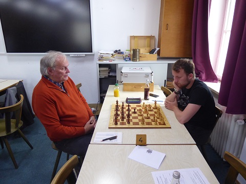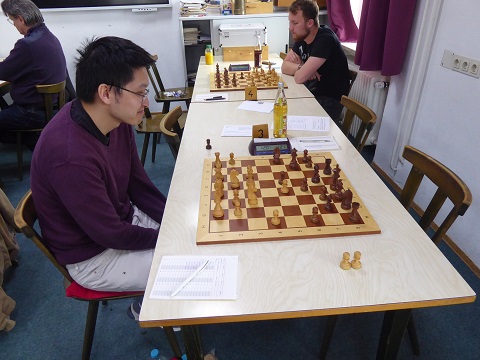 Konrad schnitzte sich an Brett 8 (Schwarz) frühzeitig einen gedeckten Freibauern im Zentrum, brauchte aber Glück, um seine Figuren nachholen zu können. Als endlich die schwarzen Linienfiguren ins Freie kamen, geriet plötzlich Weiß unter Druck und fand nicht mehr die besten Paraden. 2:0 um 12:40 Uhr.