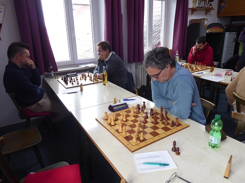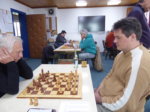 Weniger Fortune mit Remisangeboten hatte unser erkälteter Christoph an Brett 4 (Schwarz). Er lehnte zwei Offerten ab und besaß einen Mehrläufer, aber die weißen Schwerfiguren bekamen den schwarzen König am Sumo-Wickel. Nur noch 3:2 (13:30 Uhr). An Brett 6 hatte Winfried (Schwarz) nicht nur einen Hexenschuss, sondern auch eine äußerst zähe Verteidigungsstellung auszuhalten. Jedoch war es Weiß, der schließlich als erster die Nerven und eine Leichtfigur verlor, wonach Winfried sich den Punkt nicht mehr nehmen ließ. 4:2 um 13:40 Uhr.