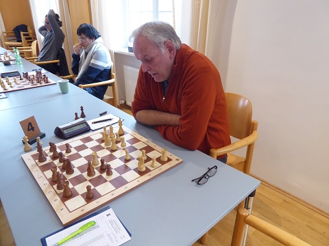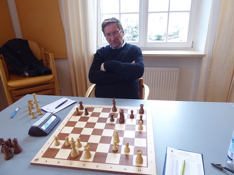 Rekordverdächtig kurzfristig musste Mannschaftsleiter Konrad an Brett 8 für Elmar einspringen. Trotz der weißen Steine kam er nur mit Ach und Krach ohne Materialverlust aus der Grünfeldindischen Eröffnung. Ausgerechnet als das Schlimmste überstanden schien, übersah er einen schönen aber eigentlich wohlbekannten taktischen Trick und musste eine Figur abschreiben. 0:1 --- „Jetzt bist du wieder Mannschaftsleiter“, sagte Winfried.