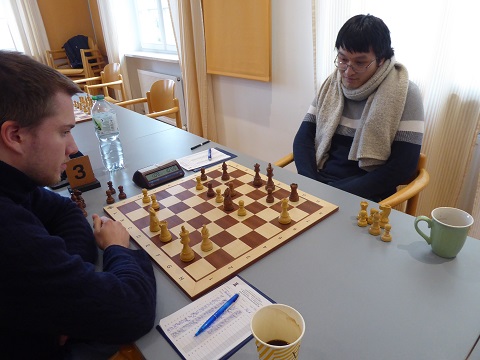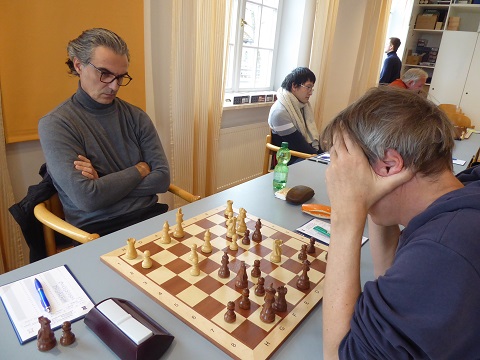 Eine typische Christophpartie gelang Christoph an Brett 4 (Weiß). Er entwickelte seine Figuren langsam aber unaufhaltsam und ging dann im richtigen Moment ins Endspiel über. Einem freien Mehrbauern und dem aktiveren König von Weiß konnte Schwarz im gleichfarbigen Läuferendspiel nicht standhalten. Jetzt stand es erst einmal gleich, 2,5:2,5, aber für wie lange?