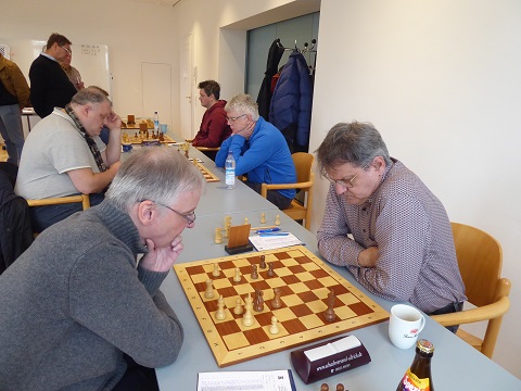 Hagen lag an Brett 5 im Clinch mit einem Weißspieler, der ebenfalls taktikaffin war. Ein Wunder, dass keiner der Beiden vom Hochseil fiel. Weiß besaß zwar einen freien Mehrbauern in der h-Linie bekam ihn aber im Endspiel T+L gegen T+S nicht flott und willigte ins Remis ein. 3:3, eine Sorge weniger.