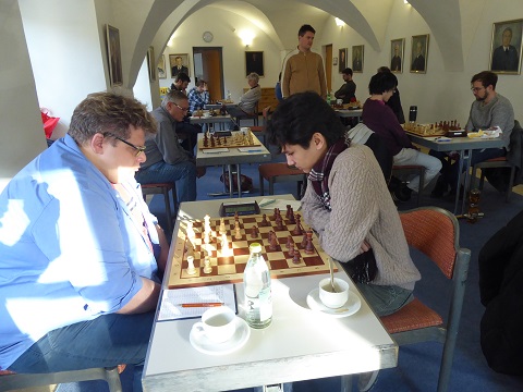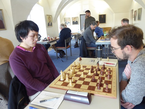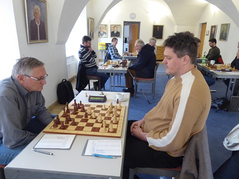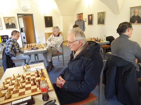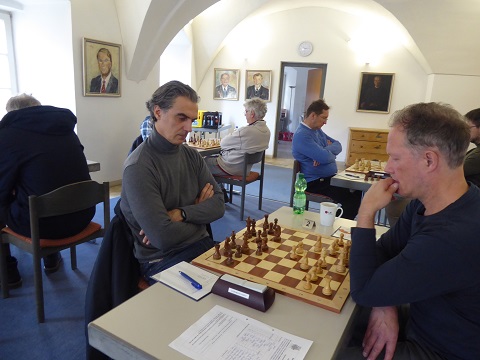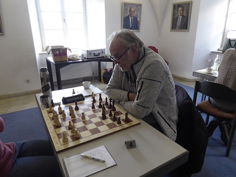 Bei Winfried an Brett 5 (Weiß) sah es nach Gewinnmöglichkeit aus, zumal er eine Qualität gewonnen hatte. Aber die weißen Türme waren danach an so viele Deckungsaufgaben gebunden, dass sie schier unbeweglich waren. Also waren beide Kontrahenten mit Remis einverstanden. 2:1 um 13:05 Uhr.