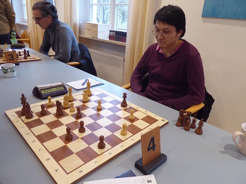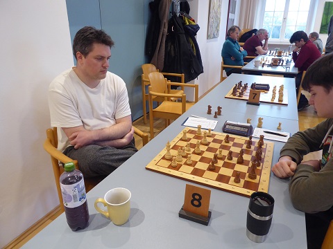 Dadurch brauchte Christoph an Brett 5 (Schwarz) keinem ganzen Punkt mehr nachzujagen. Dennoch war er nahe daran, in einem Endspiel mit gleichfarbigen Läufern die weißen Figuren auszutemporieren. Tatsächlich gelang ihm die Eroberung eines weißen Bauern, aber der letzte schwarze Bauer war nicht durchzubringen, der weiße Läufer hätte sich einfach für ihn opfern können. Also Remisschluss zum Endstand von 4:4 um 15:10 Uhr, ein langer Tag ging glimpflich zu Ende.