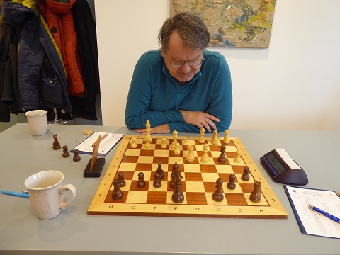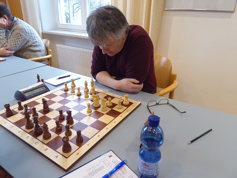 Bereits nach zwei Stunden durfte Winfried an Brett 7 (Schwarz) einen ganzen Punkt sein Eigen nennen. Seiner Dame war es gelungen, aus großer Entfernung einen weißen Springer zu fesseln, der danach unparierbar zusehen musste, wie ein Bauer auf ihn zukam. 1:0.