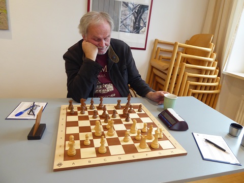 Anton orchestrierte an Brett 4 eine langanhaltende komplexe weiße Initiative, die jedoch implodierte, als Schwarz Damentausch erzwingen konnte und bei der Gelegenheit durch Springerschach einen weißen Zentralbauern eroberte. Aber Antons letzter Springer ging seinerseits rechtzeitig auf Bauernfang, so dass die Kontrahenten sich zum Glück die Hände reichten. 3,5:3,5 um 14:35 Uhr.